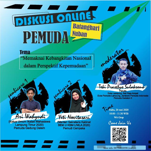 Lampung Timur – Ditengah suasana ramadhan dan adanya pendemi Covid-19. Sejumlah Pemuda Pemudi Kecamatan Batanghari Nuban telah menyelenggarakan diskusi kepemudaan secara daring pada Rabu, 20 Mei 2020 dalam rangka memperingati Hari Kebangkitan Nasional yang diikuti oleh sejumlah peserta.