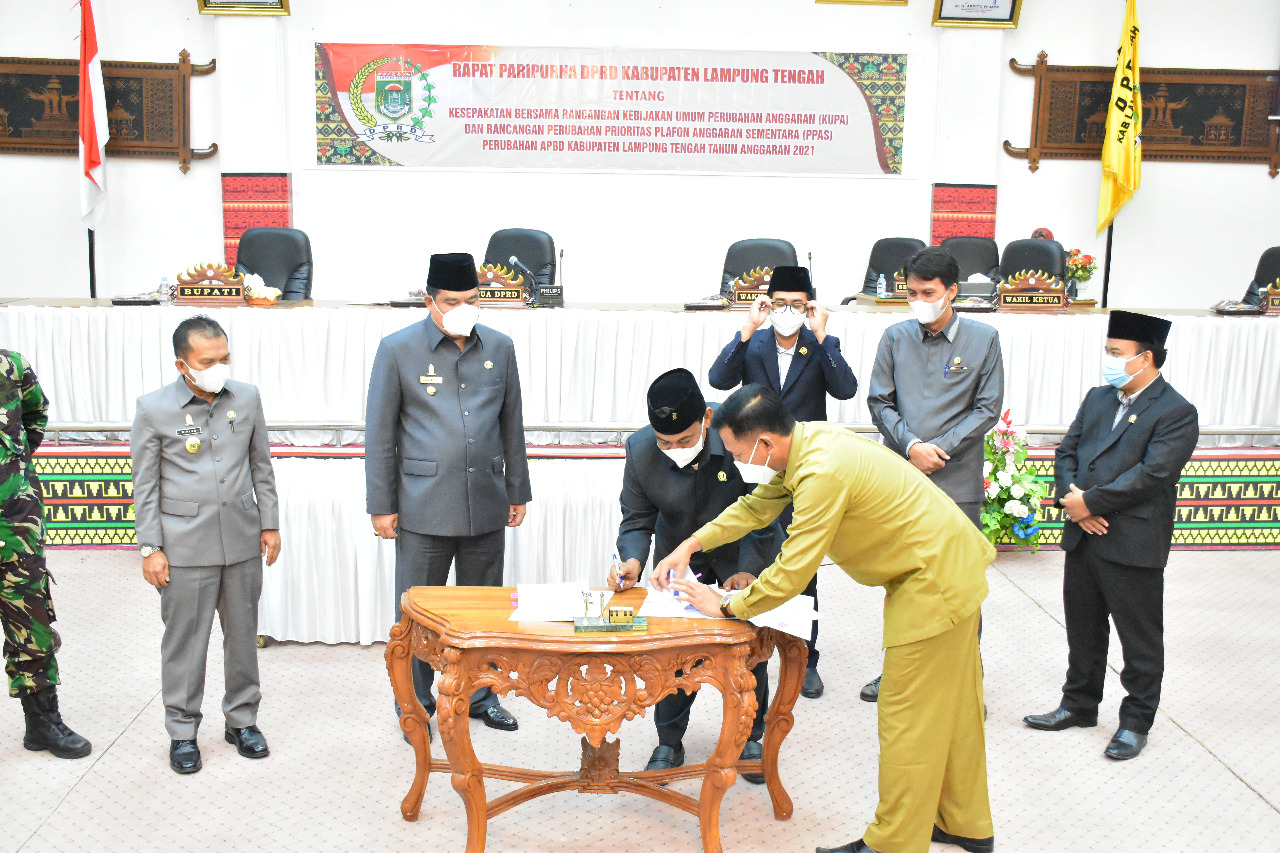 LAMPUNG TENGAH – DPRD Lampung Tengah (Lamteng) Menggelar Rapat Paripurna Kesepakatan Bersama Rancangan Kebijakan Umum Perubahan Anggaran (KUPA) dan Prioritas Plafon Anggaran Sementara (PPAS) Perubahan APBD Tahun 2021, di Gedung Dewan setempat, Senin (13/9/2021).